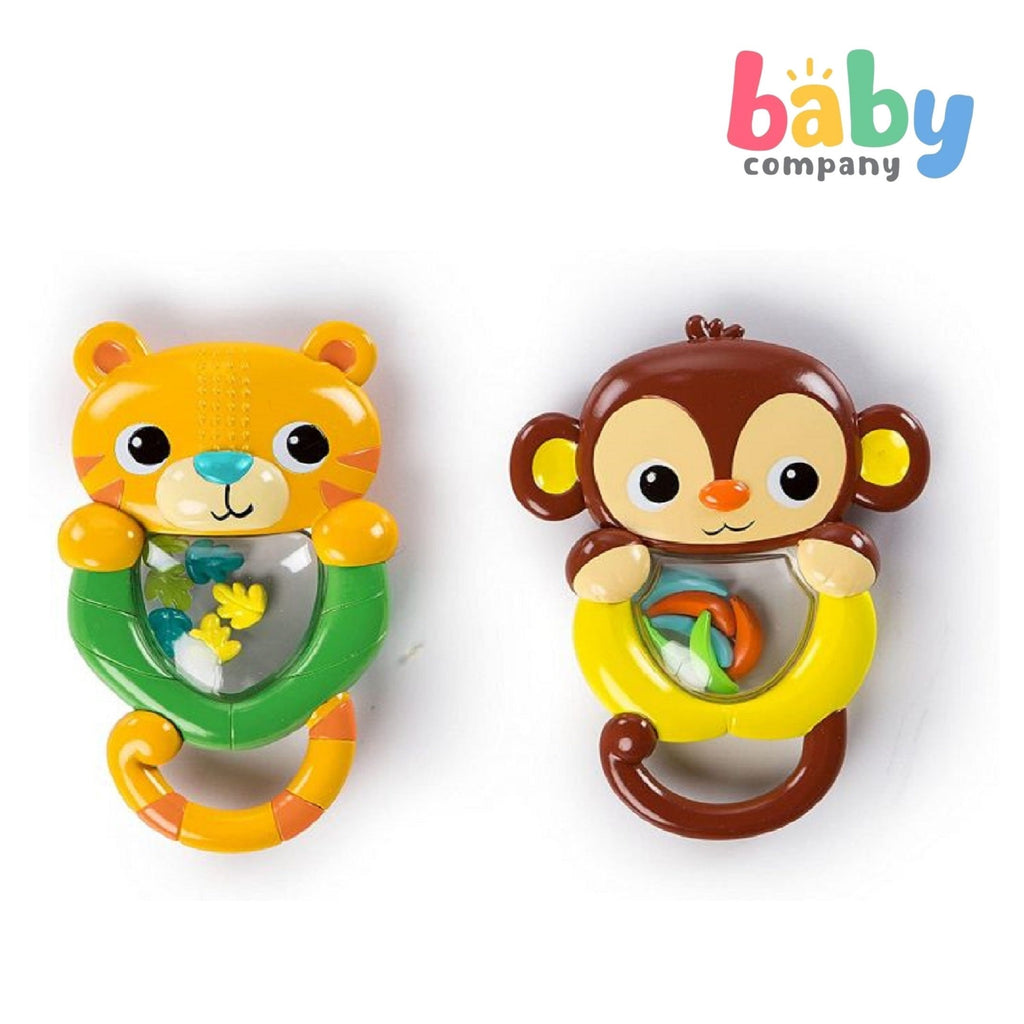 Jungle themed characters provide engaging rattle sounds for encouraging auditory stimulation Each sold separately Colorful shaped beads in the belly make fun sounds Fun-shaped rattle beads