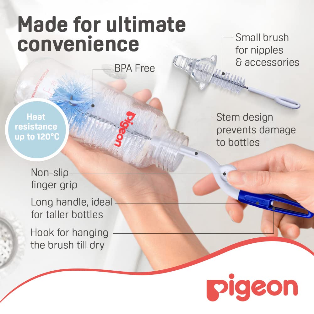 2 effective ways for better cleaning - 360° rotary use and straight use 360° rotary handle for thorough cleaning of glass nursing bottles Easy handle and finger grip at the most appropriate angle for ease of washing Nylon bristles enable thorough scrubbing and cleaning of bottle walls High density nylon tip effectively removes tough stains at the bottom of bottles Comes with a nipple brush to clean smaller areas of the nipples.