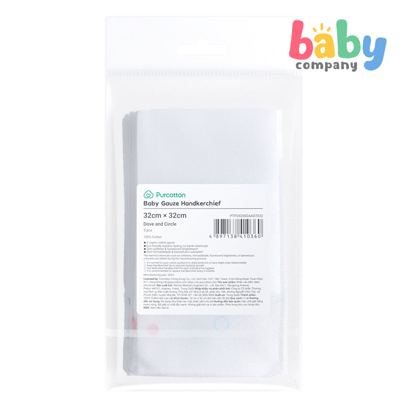 Purcotton Baby Gauze 3-Piece Handkerchief - Dove & Circle (32x32cm)