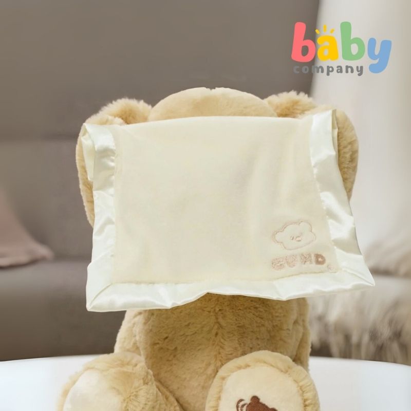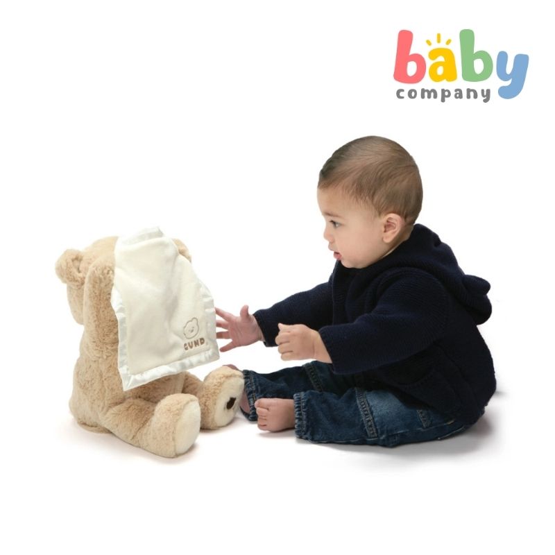 The Baby GUND animated Peek-a-Boo Bear is a cute and super-soft friend who’s always ready to share giggles and a fun game of peek-a-boo with baby! This adorable tan 11.5” teddy bear plush animal features a classic design and a mouth and arms that move up and down during play. At the push of a button, the bear recites one of six different phrases and hides behind the satin-accented blanket, before popping back out to delight baby with a surprising interactive game of peek-a-boo. This bear is surface washable for easy, convenient cleaning and appropriate for ages 0 and up. Ships in a protective poly bag. The baby dolls, infant toys, and stuffed animals in the Baby GUND collection are all crafted with baby’s safety in mind and make the perfect baby shower gifts, as well as nursery and home décor.
