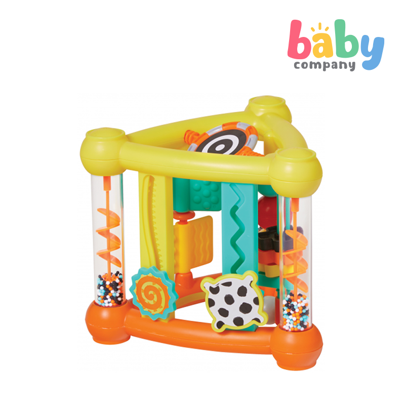 Entertain your baby with the Infantino Activity Triangle. This colorful and fun learning toy is designed for babies six months old and older. The bright colors and fun shapes on the baby activity triangle engage your baby's senses. This toy helps to develop your baby's hand-eye coordination skills. The Infantino learning toy has five sides to play with, and features ten fun activities, like rattling beads, spinning knobs, moving pieces, and texture wheels. It even has a twisting mirror.