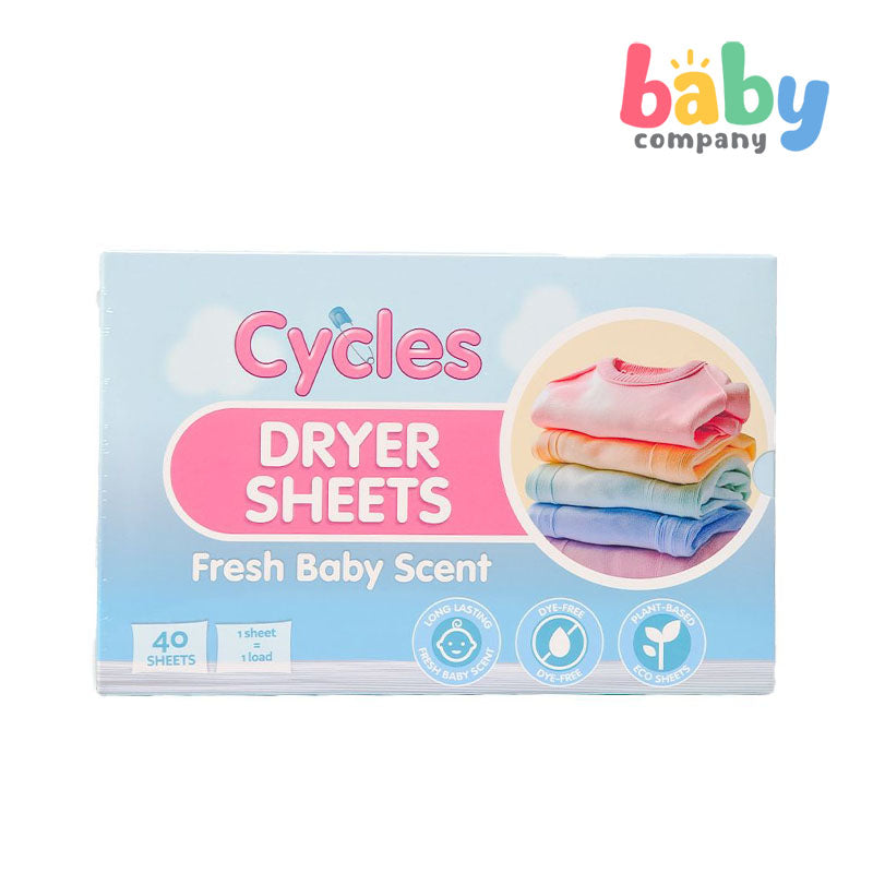 Cycles Dryer Sheets are formulated to naturally reduce static cling and soften clothes without using any harsh chemicals, dyes, or strong fragrances. It is your perfect replacement to fabric softeners that is baby safe and It’s the perfect complement to our existing Cycles Baby Detergent and Stain Soaker products.