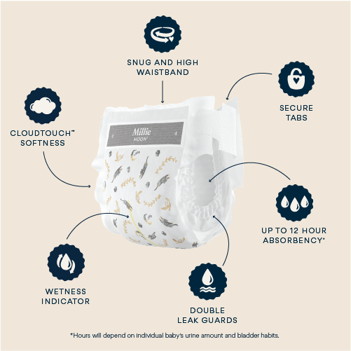 Here at Millie Moon, we think your little one deserves the very best. The moon, in fact. Which is why we have made it our mission to provide a range of luxury diapers that are expertly crafted, luxuriously soft and designed to perform. Only Millie Moon Luxury Diapers have CloudTouch™ Softness for ultimate comfort. Made with a high-GSM topsheet to instantly absorb moisture, Millie Moon Luxury Diapers are designed to keep skin dry and help reduce rashes. For diapers so soft they feel like a cloud and fit like a dream, choose Millie Moon.